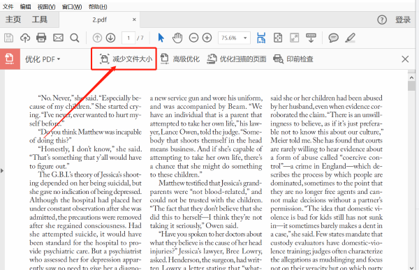 2、打开PDF文件后,点击【减少文件大小】功能然后点击确定,这样PDF压缩就完成了。