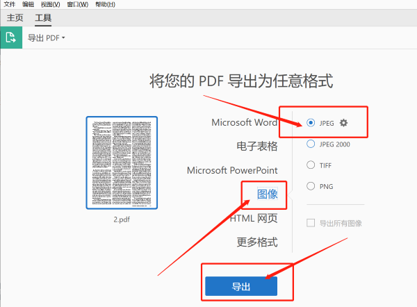 3、选择将PDF导出为图像格式-JPG格式,最后点击导出即可,这样PDF转jpg就完成了。